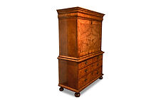 Queen Anne escritoire in figured walnut. Top section features cushion drawer to the upper frieze and a large fall that reveals pigeonholes, drawers and a leather inset surface. Numerous secret drawers are hidden behind the pigeonholes and drawers.
