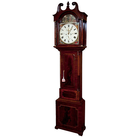 Fancy for a country clock, this particular tall case clock has an impressive dial and mahogany cross banding and inlay that dress it up in formal wear suitable for a country estate. A beautifully arched swan neck pediment on the bonnet leads the eye down to a painted break arch featuring the small portrait of a girl holding a dove. The narrow case has a tombstone door flanked by fluted quarter columns and the base is raised on shaped bracket feet.