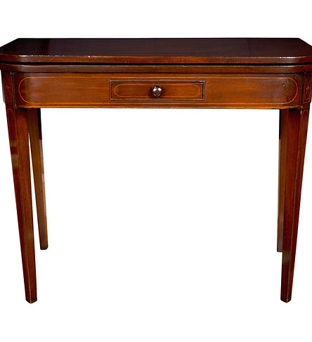 Regency mahogany flip top game table on tapered legs has beautifully rounded corners. Attractive string inlay adorns the apron and legs while a rounded beading surrounds the centrally located drawer, which appears to have its original wood knob. Utilizing a swing leg support, the table opens to a near 36"square playing area.
